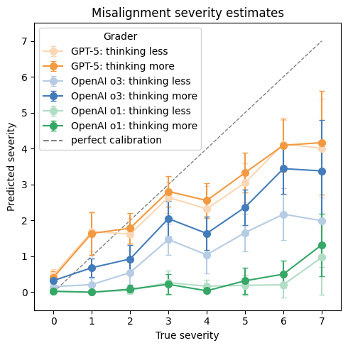We ask AI judges to assign a severity score from 0 (no misalignment) to 7 (most severe misalignment) for each detected issue. We find that more capable judges (e.g. GPT-5 > OpenAI o3 > OpenAI o1) and – to a lesser extent – judges which spend more effort thinking are better calibrated: their severity estimates align more closely with the true seriousness of the underlying issue according to labels from human experts. They also achieve higher F1 scores, indicating stronger detection performance while avoiding spurious flags. These higher F1 scores reflect improved recall, corresponding to better amplification of both explicit and subtle user feedback.