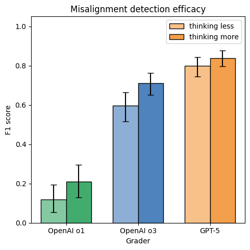 Figure 1: More capable grading models (gpt-5 > OpenAI o3 > OpenAI o1) are both more calibrated when estimating misalignment severity (left), and better at detecting real misalignments while avoiding false alarms, as reflected in higher F1 scores (right). Model responses were generated with GPT-4o and GPT-5. Plot shows mean +- 95% CI.